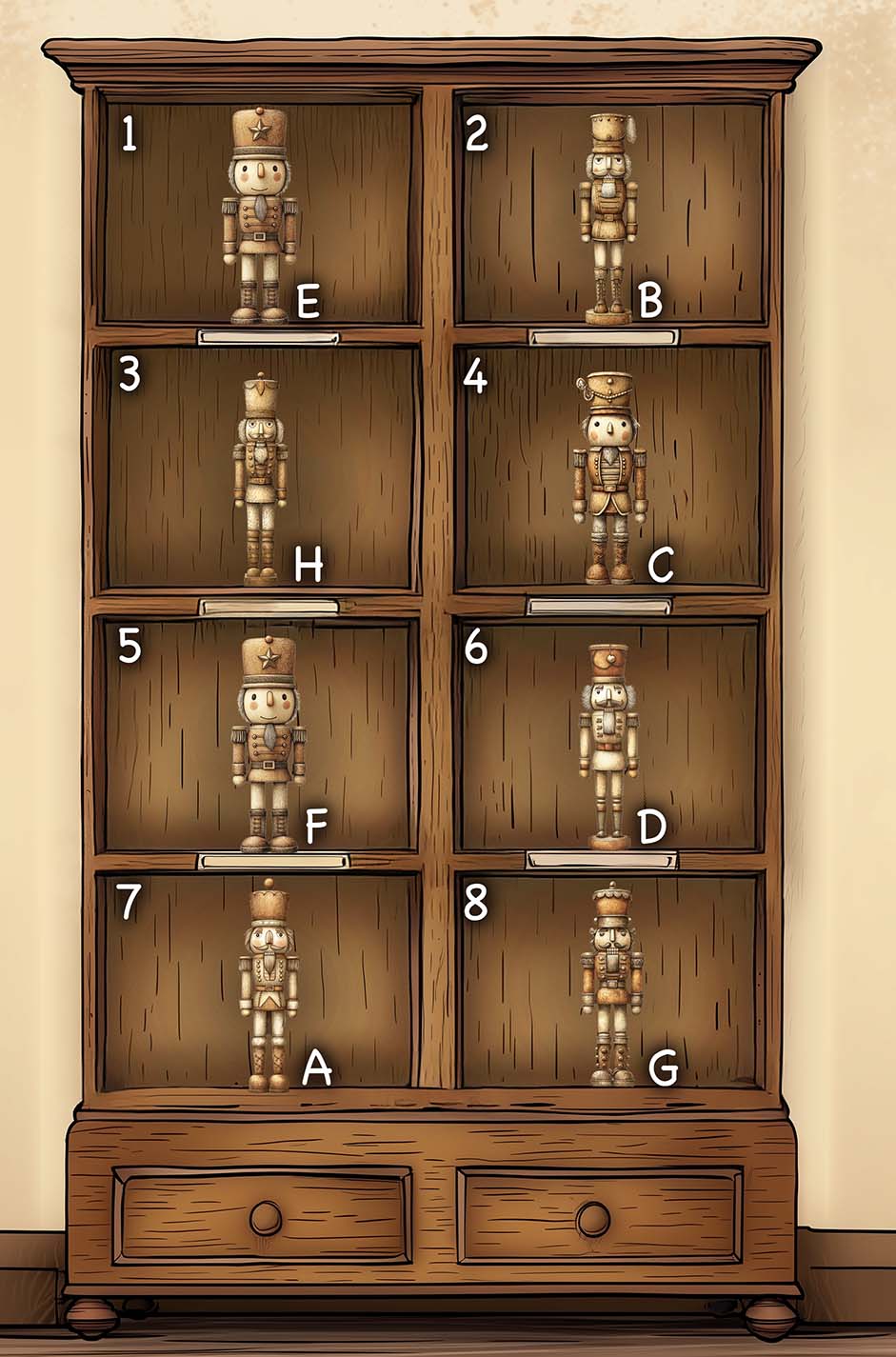 The toy soldiers were removed from the cabinet and left in a jumble. But their original spots left faint shadows in the dusty wood. Penelope believes each outline matches a specific toy.