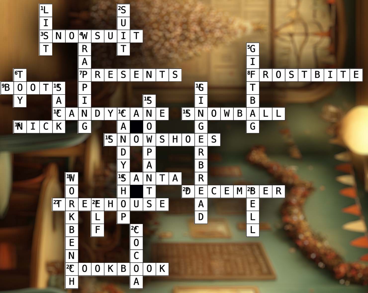 3. SNOWSUIT – Head-to-toe winterwear 7. PRESENTS – Gifts wrapped for Christmas morning 8. FROSTBITE – A chilly risk in the great outdoors 9. BOOTS – Worn on snowy rooftops 13. CANDYCANE – A red and white peppermint classic 15. SNOWBALL – What kids throw in a friendly winter fight 16. NICK – As in "Saint ___" 17. SNOWSHOES – Used for walking in deep snow 19. SANTA – The man in red himself 20. DECEMBER – The most festive month of them all 22. TREEHOUSE – A wooden hideout nestled in the branches 25. COOKBOOK – For festive recipes 1. LIST – What Santa checks twice 2. SUIT – Santa’s red outfit 4. WRAPPING – What covers a surprise 5. GIFTBAG – A quick way to wrap a present 6. TOY – A Christmas morning surprise 10. SACK – Where Santa keeps gifts 11. GINGERBREAD – A favorite holiday treat 12. SNOWPANTS – Warm gear for playing outside 14. CANDYSHOP – Where the elves restock 18. WORKBENCH – Where toys get assembled 21. BELL – It jingles all the way 23. ELF – Santa’s tiny helper 24. COCOA – Warm drink served in winter Solution to Scrambled Word (Red Circle Letters)