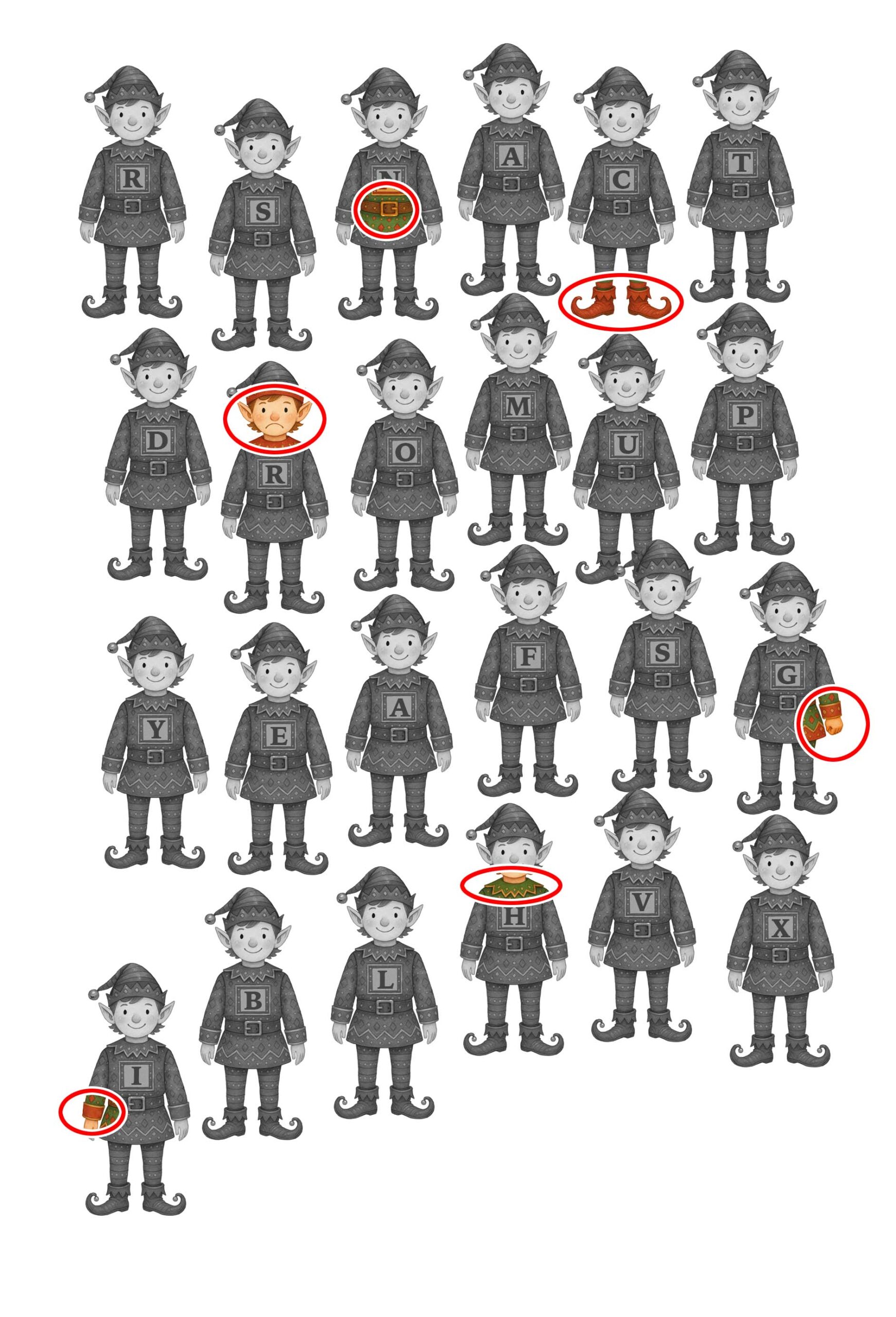 The elves weren’t quite as identical as they first appeared. Six of them had small differences in their stitching, and together their letters spelled out the hidden word.